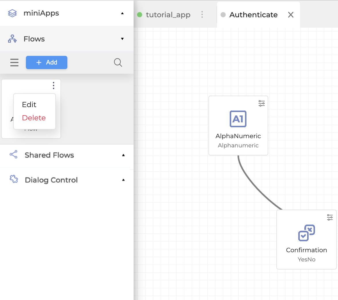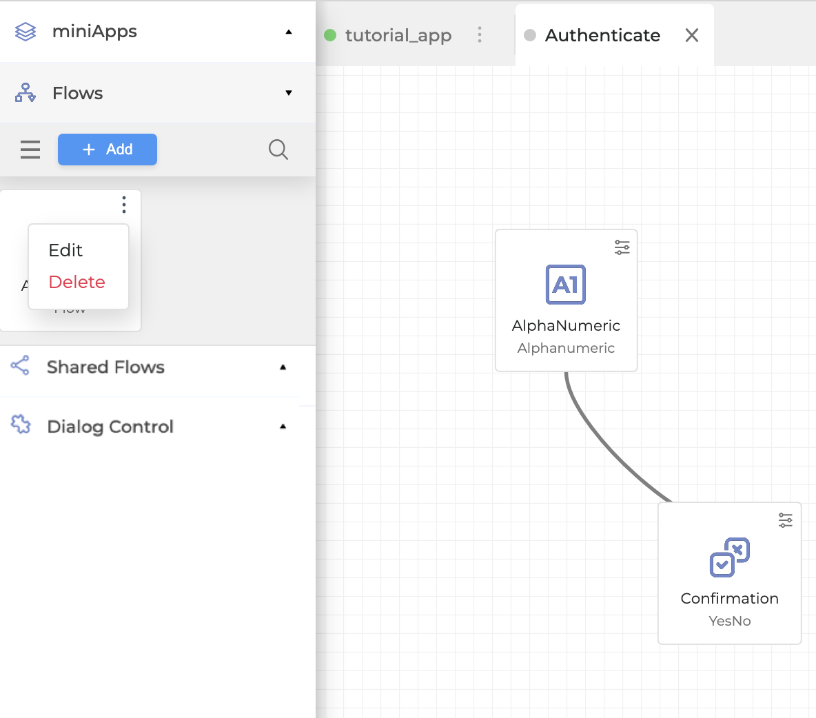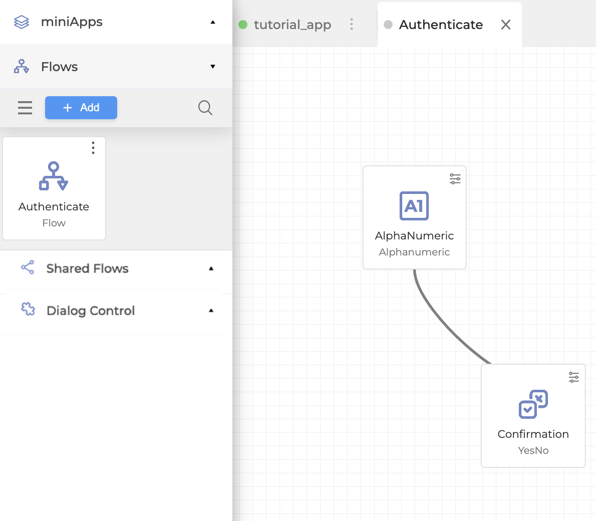 A Flow is a reusable building block that can contain miniApps, Conditions, Transfers, and even other Flows grouped according to the predefined logic same as a Dialog Application. As a Dialog Application scenario grows and has more building blocks, it is recommended to organize parts of it logically grouped and saved, or to have it prepared to use while building a different Dialog Application. These cases can be covered with the Flow building block.