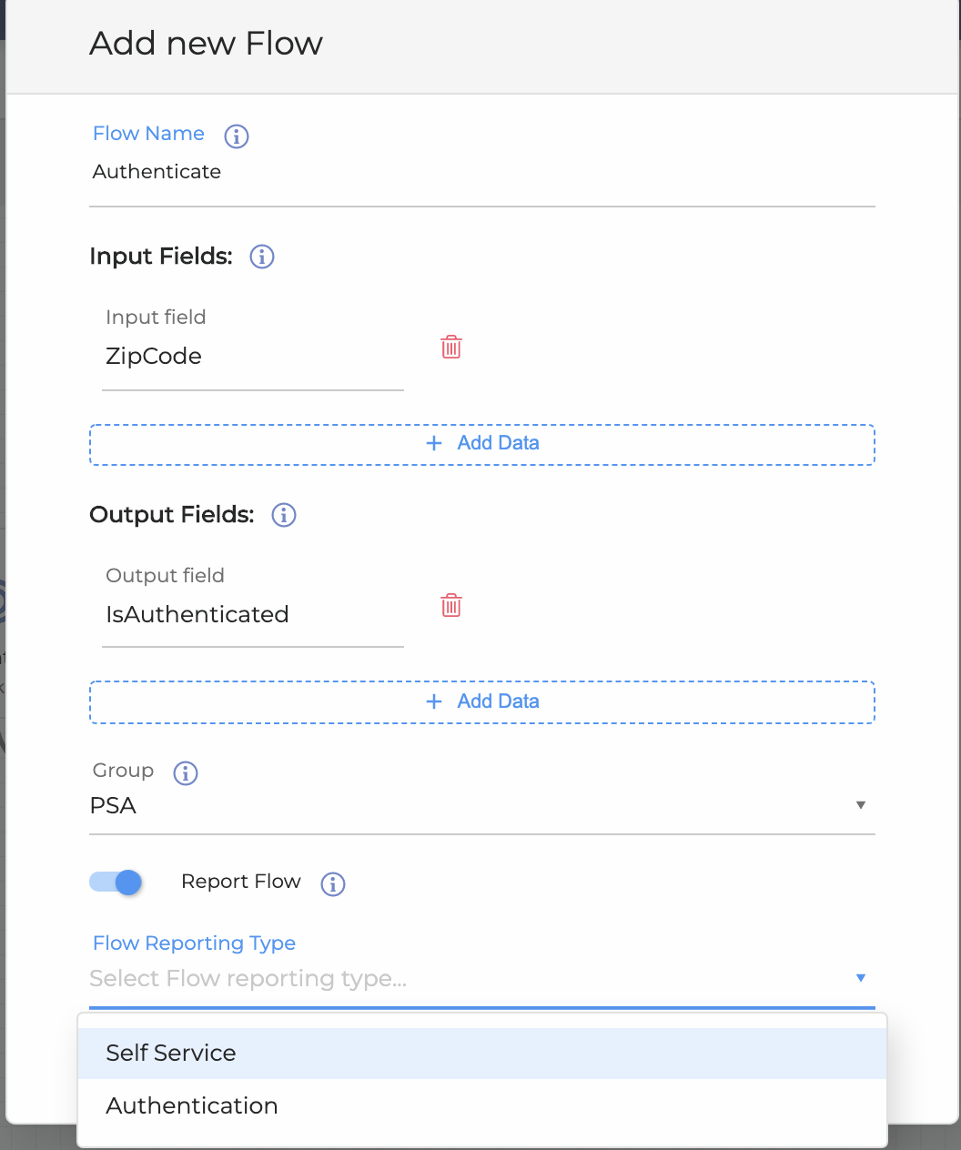 Switch the Report Flow toggle button and select the reporting type (Self Service or Authentication) in order to tag the Flow in relation to what will be visible in the Analytics dashboard for various business reasons.