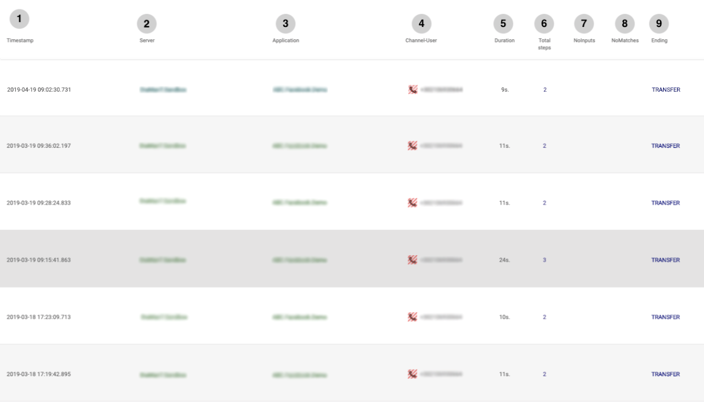 All calls appear in a Session List. The most recent call holds the top of the list by default. The columns of this list are the following: