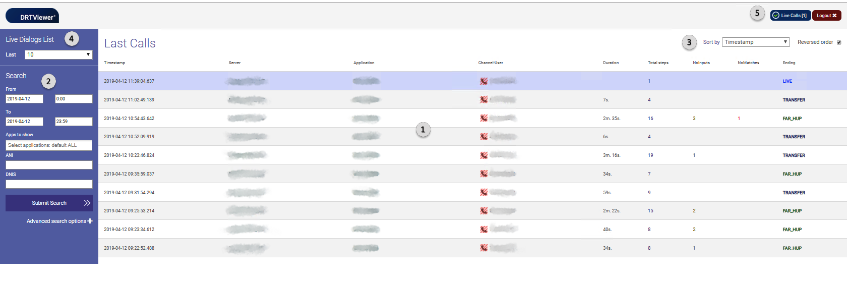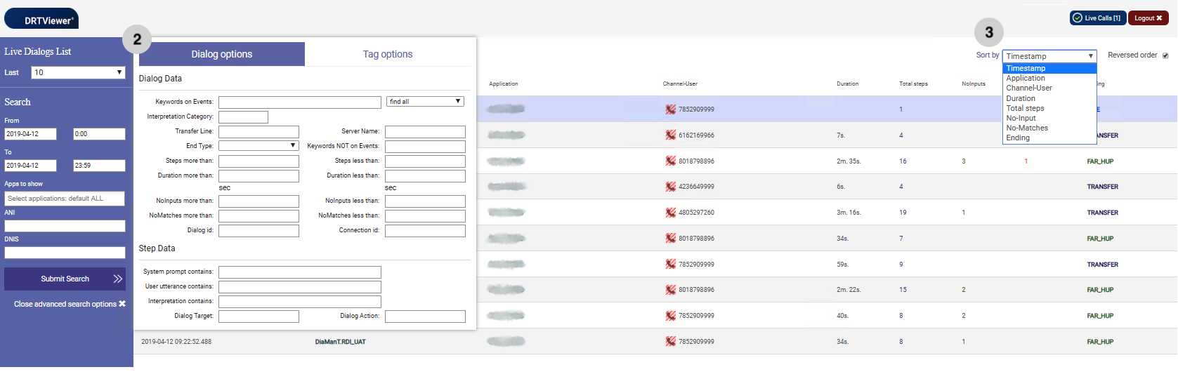 By clicking on the Search and Sort by options tabs (2)(3), you can expand these views and perform basic or advanced session searches, based on the chosen filtering criteria.