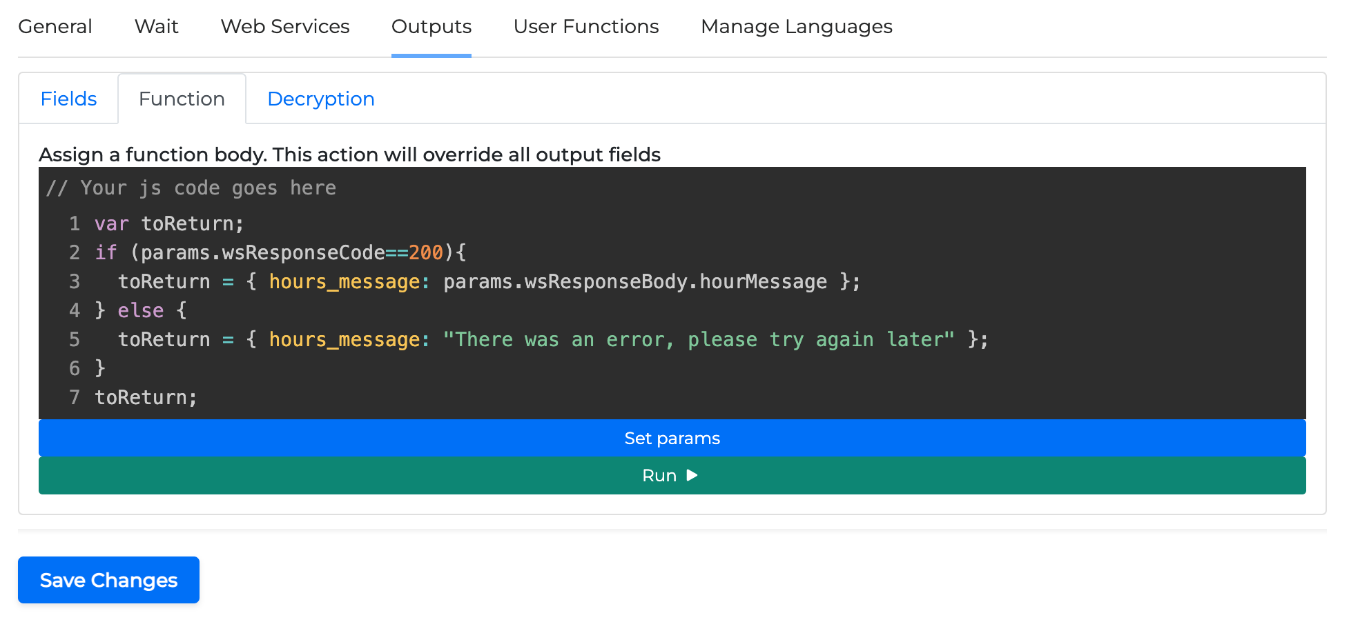 In the Function sub-tab, you can write a JavaScript function to get some specific values of the response and set them as the output of the miniApp. This is a useful approach because it allows you to process all the data at once and then get exactly what you need (for instance, you might sort some values, calculate time difference, and so on).