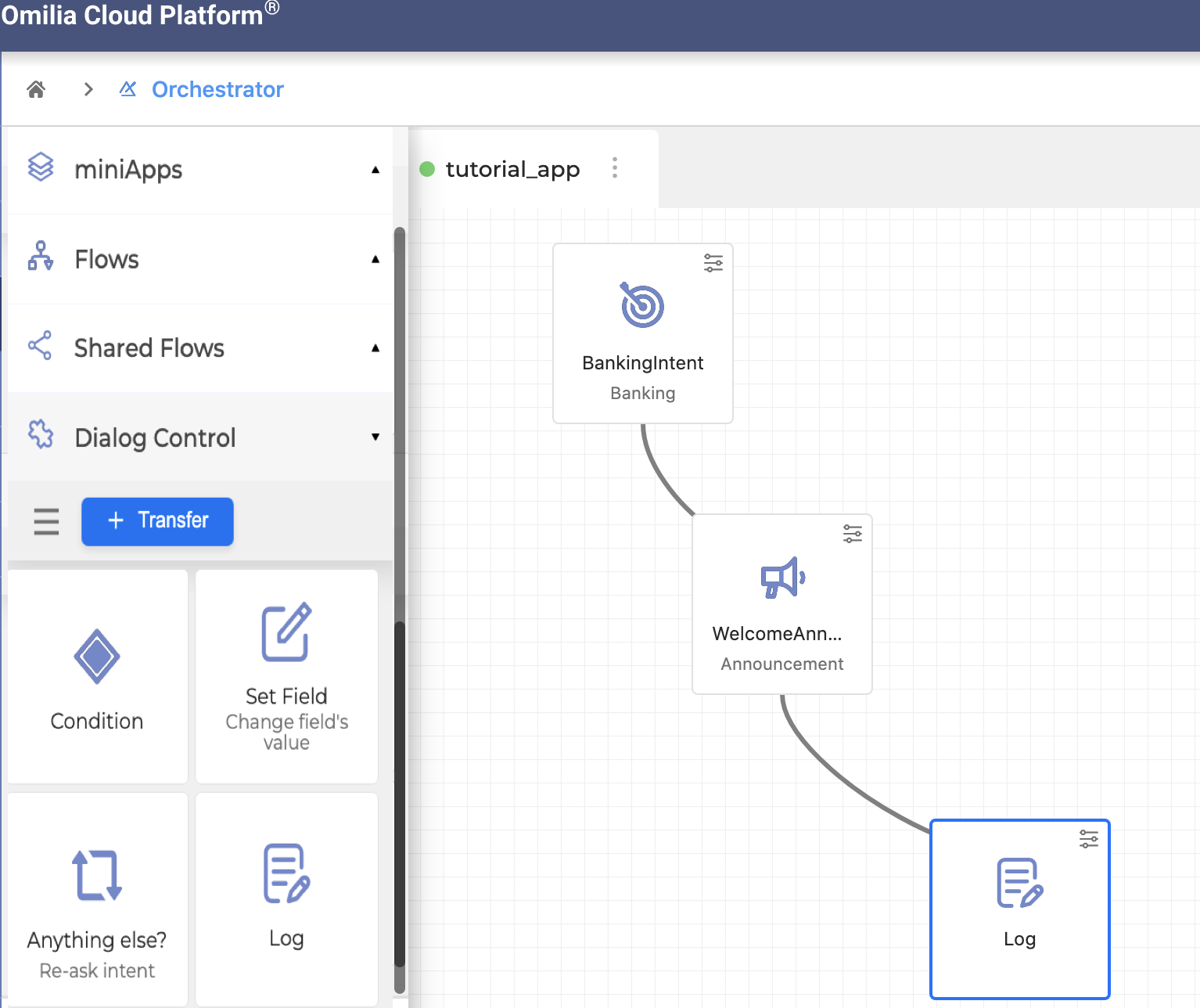 Choose the Log building block from the Dialog Control panel on the left, drag and drop it onto canvas, and connect with another building block.