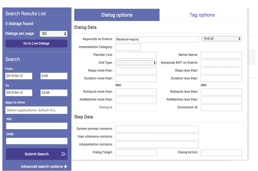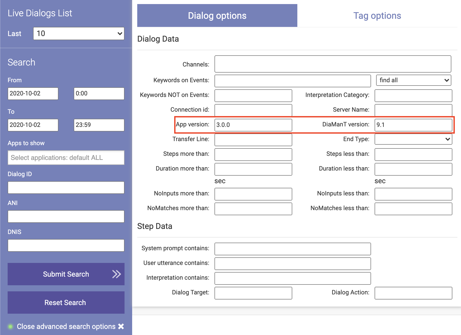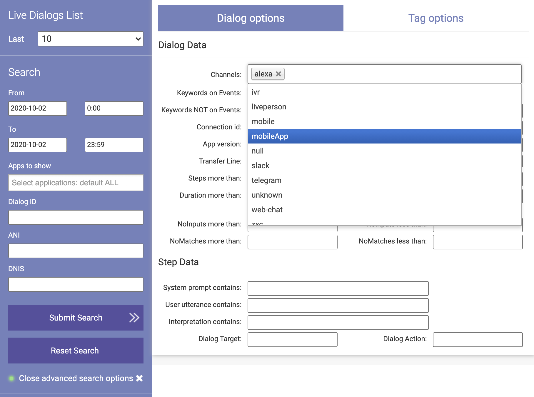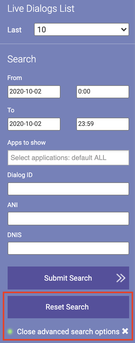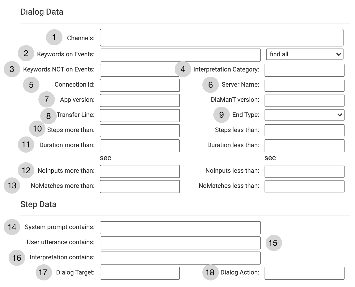 4 | Interpretation Category | This field is used for searching for dialogs based on an Intent. You fill out this field with an intent’s value to get the dialogs where intent took this value. |