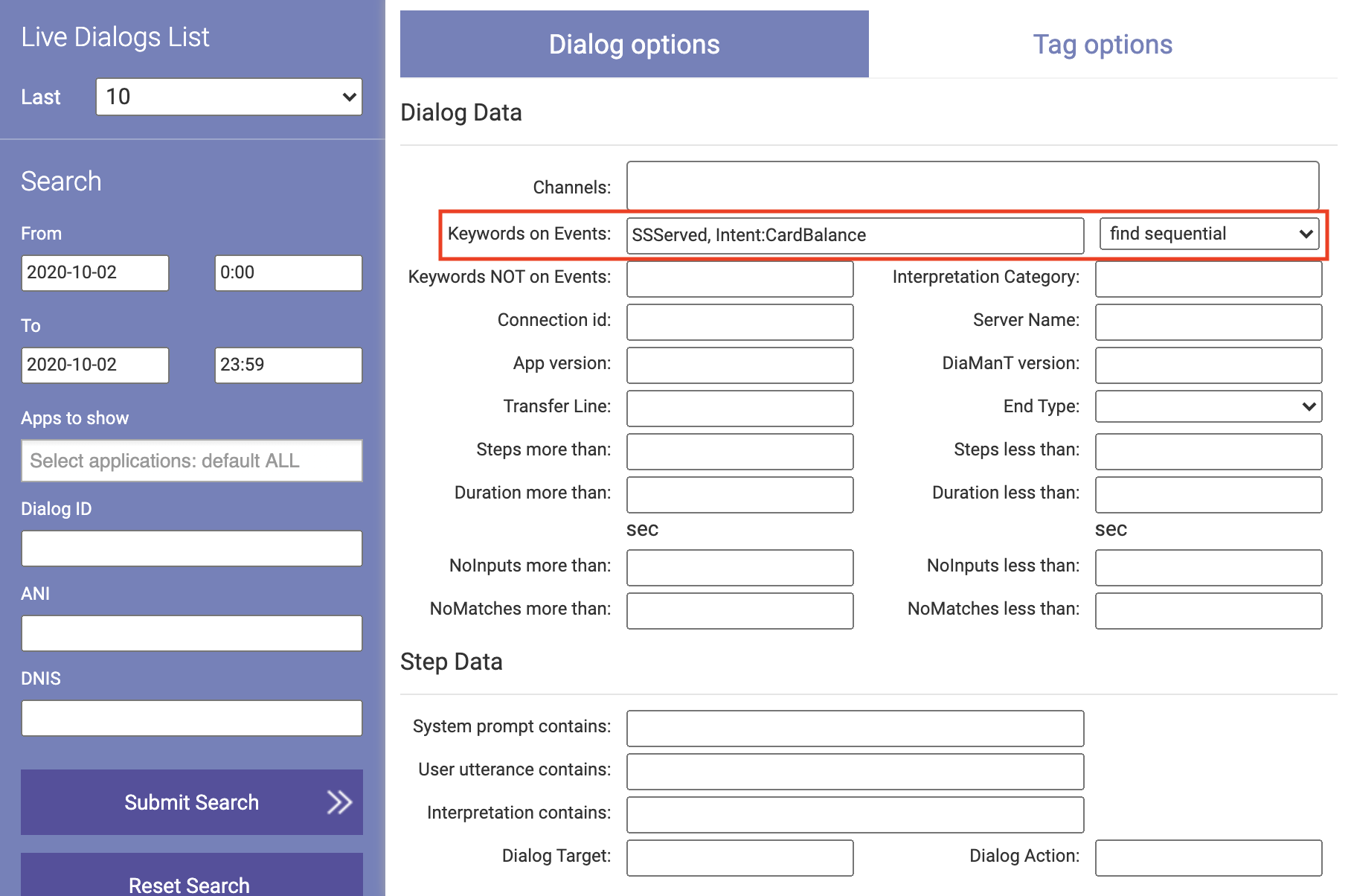 In the Dialog options tab, insert the Self Service, Intent into the Keywords on Events field and select find sequential.