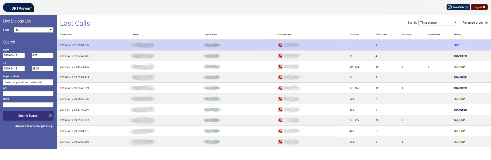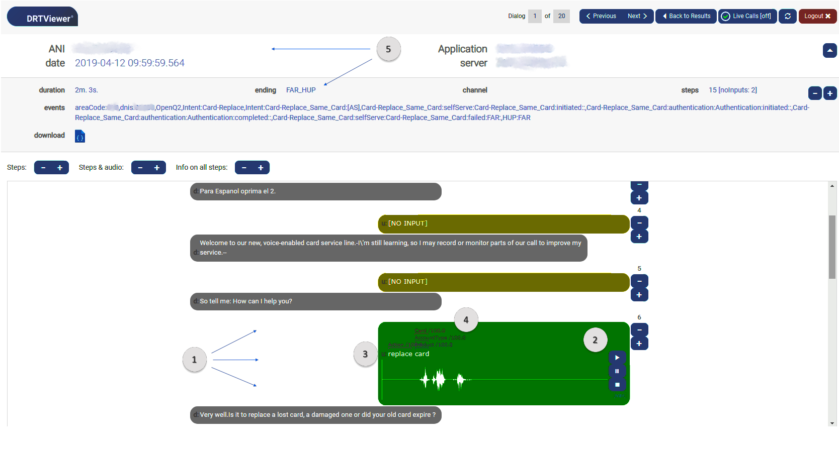 By clicking on a specific session (LIVE or completed), you can review the entire call from the welcome prompt to the end of it.