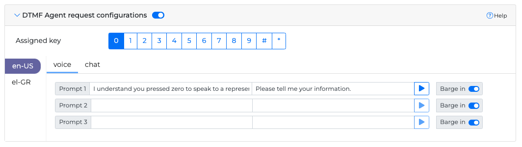 You can select one DTMF key that will indicate the request to speak to an agent. Depending on the exit policy you can set up to three different prompts to be played before directing the call to the agent.