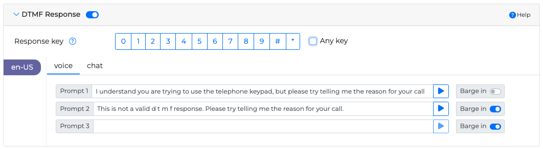 Available on Intent miniApps only, DTMF response allows you to configure a graceful response for DTMF inputs that don't have an actual meaning for the dialog evolution.