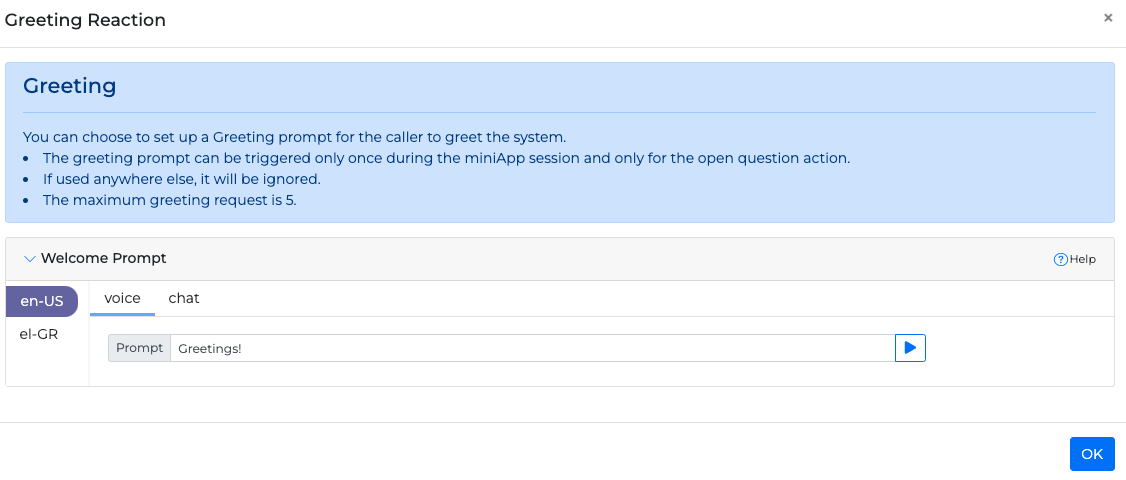 Sometimes, when prompted for input, a caller may first greet the application instead of giving the input directly. For these cases, it is possible to configure a Greeting Reaction, which will trigger in conjunction with the initial prompt resulting in a more human-like experience.