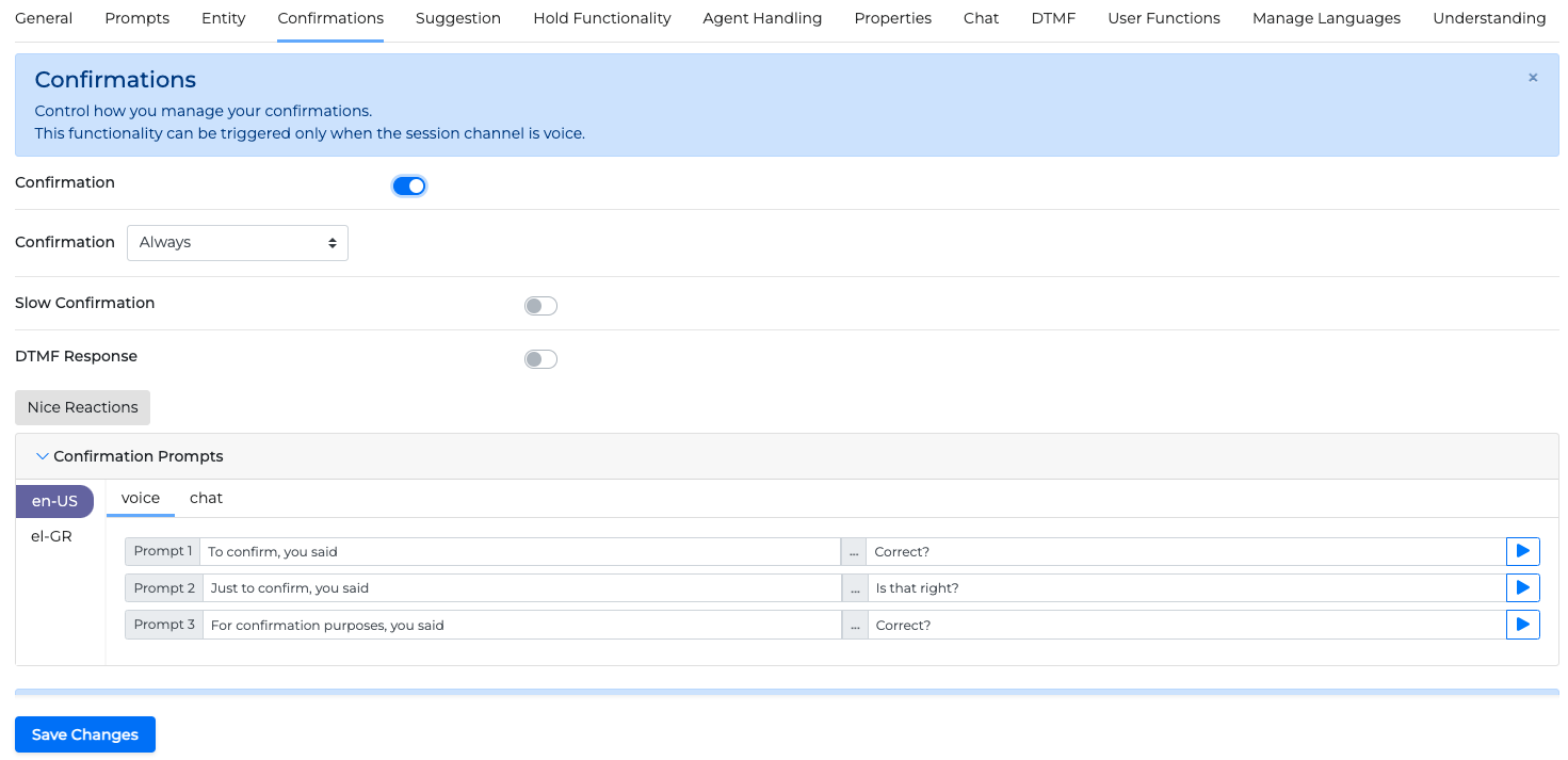 Confirmation behavior can be customized to either ask every time ("standard") or based on a confidence threshold ("dynamic"). To further enhance the customer experience, the confirmation module features an additional mechanism that, when enabled, adds short pauses between a long piece of information being read back to give time to the caller to verify it ("slow confirmation"). To resemble the legacy confirmation behavior of DTMF systems, the confirmation module also allows the caller to accept or reject using keys instead of natural language ("DTMF confirmation").