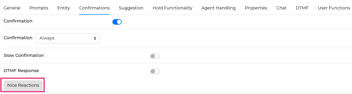 In the Nice Reactions window, you can optionally set nice reactions. Whenever the application identifies a caller confirmation, it randomly throws a nice reaction according to weight, before the confirmation or disconfirmation prompts, to make the dialog sound more conversational.