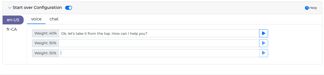 Enter the text you wish to be played as a restart prompt. For example, “Ok, let’s take it from the top. How can I help you?”.