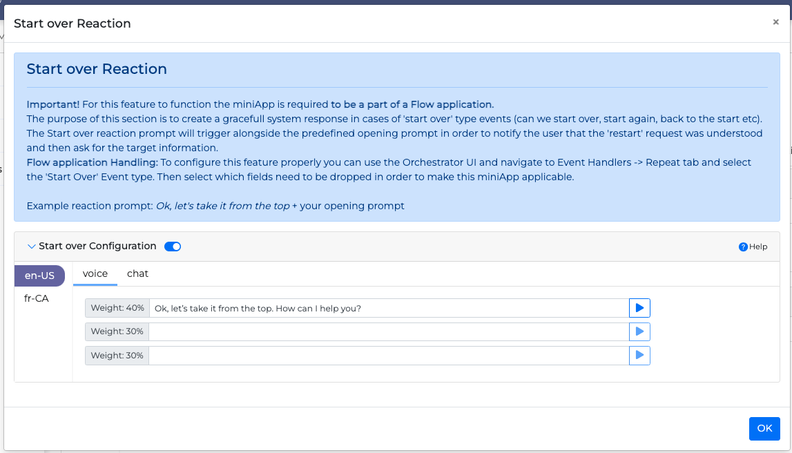 If for some reason the system takes the wrong path here, the user might be inclined to interrupt with something like “no no, can we please restart”. In that case, in your Flow you can specify that upon hearing the word “restart”, the system will enter this miniApp with the specific Start Over prompt, like “Ok, let’s take it from the top. How can I help you?” as in the screenshot below.