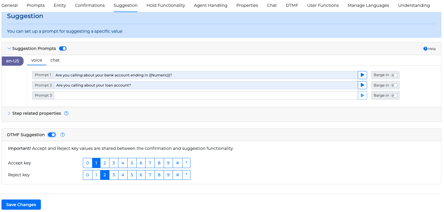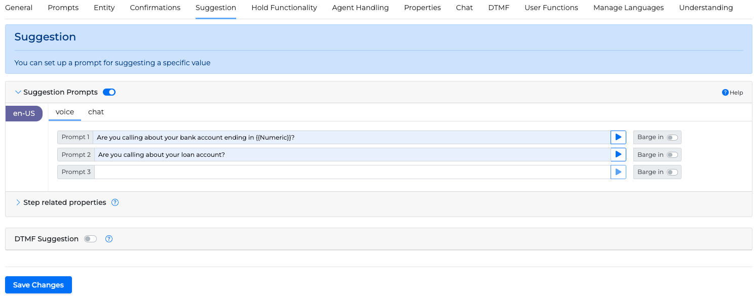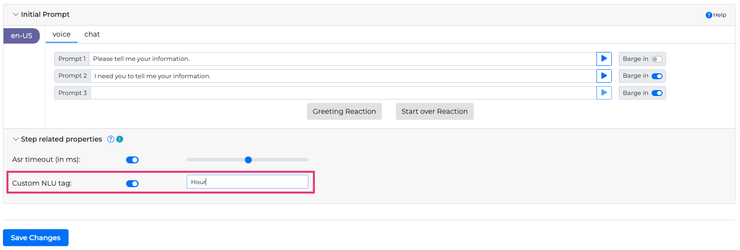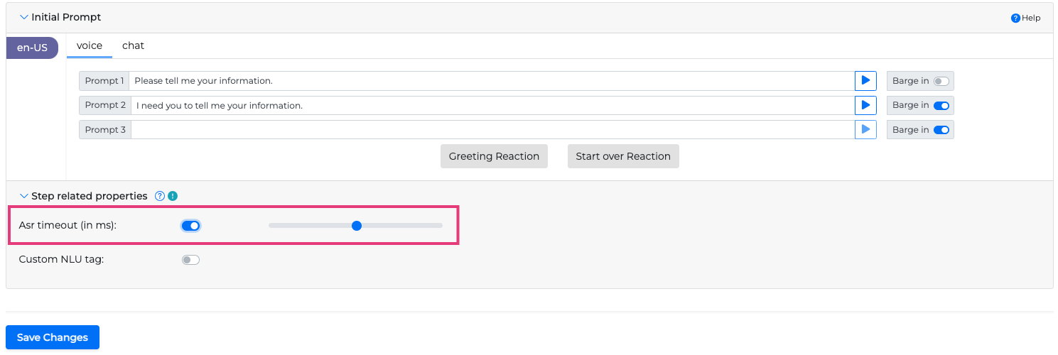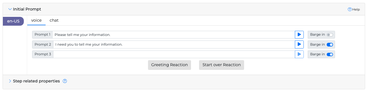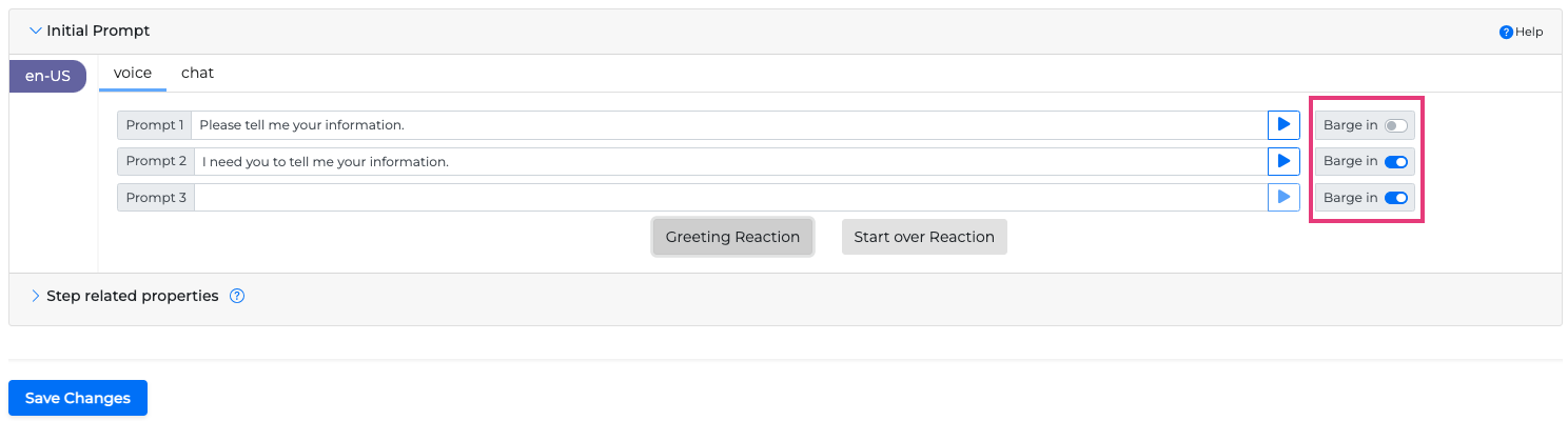 If you want to activate barge-in for each step, use the toggle on the right side of each initial prompt: