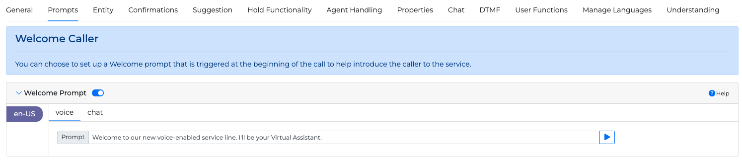 The welcome prompts are the initial prompts responsible for establishing the interaction with the system, thus providing a more natural feel. Corresponding toggle button must be on to activate the welcome prompt.