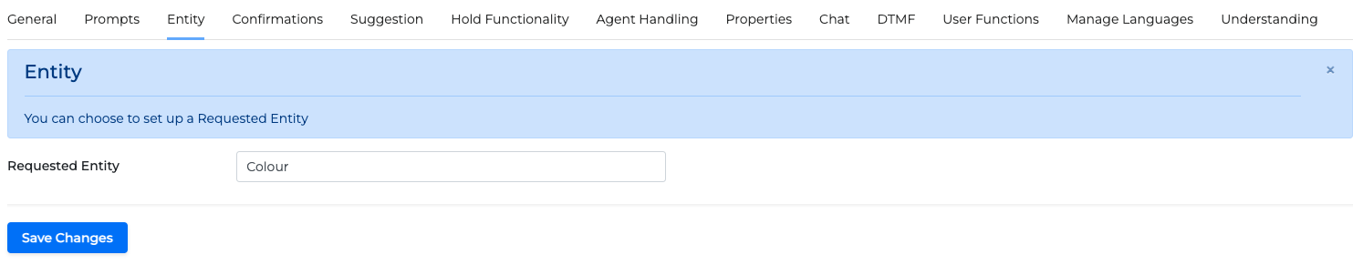 Insert an entity name in the Requested Entity box. The entity name must be a valid entity originating from the used NLU list of entities. For example, if you need to learn the callers' favourite colour pick entity Colour the universal NLU.