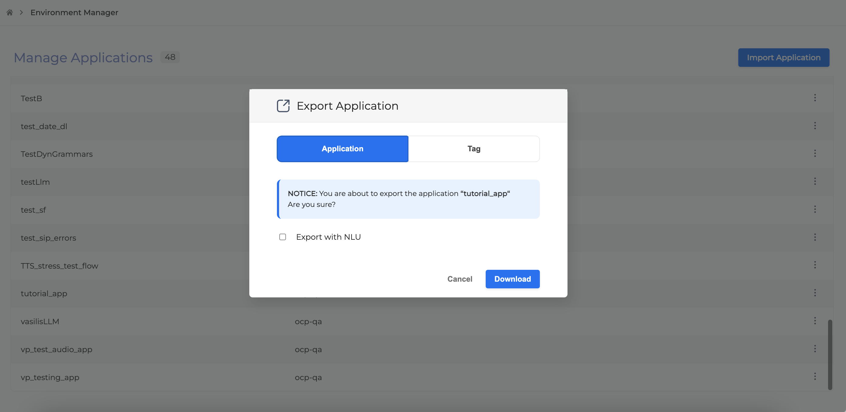 To export an Application, click Application. Here you may mark the Export with NLU box to also export NLU model references in the export files.