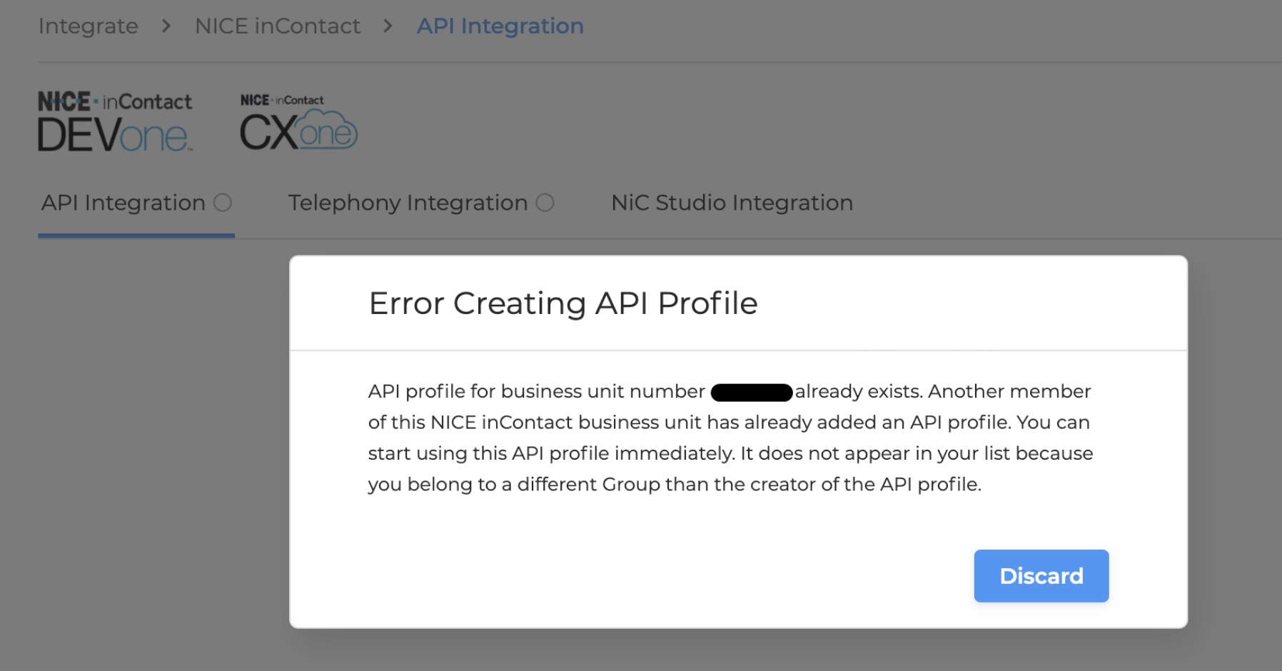 If you are trying to create an API profile and get the error pictured above, it means that another person with whom you share the NICE inContact business unit has already added an API profile for that business unit.