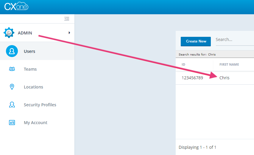 Navigate to the Admin tab in your NICE CXone profile and find your user in the Users/Employees tab, as in the screenshot below: