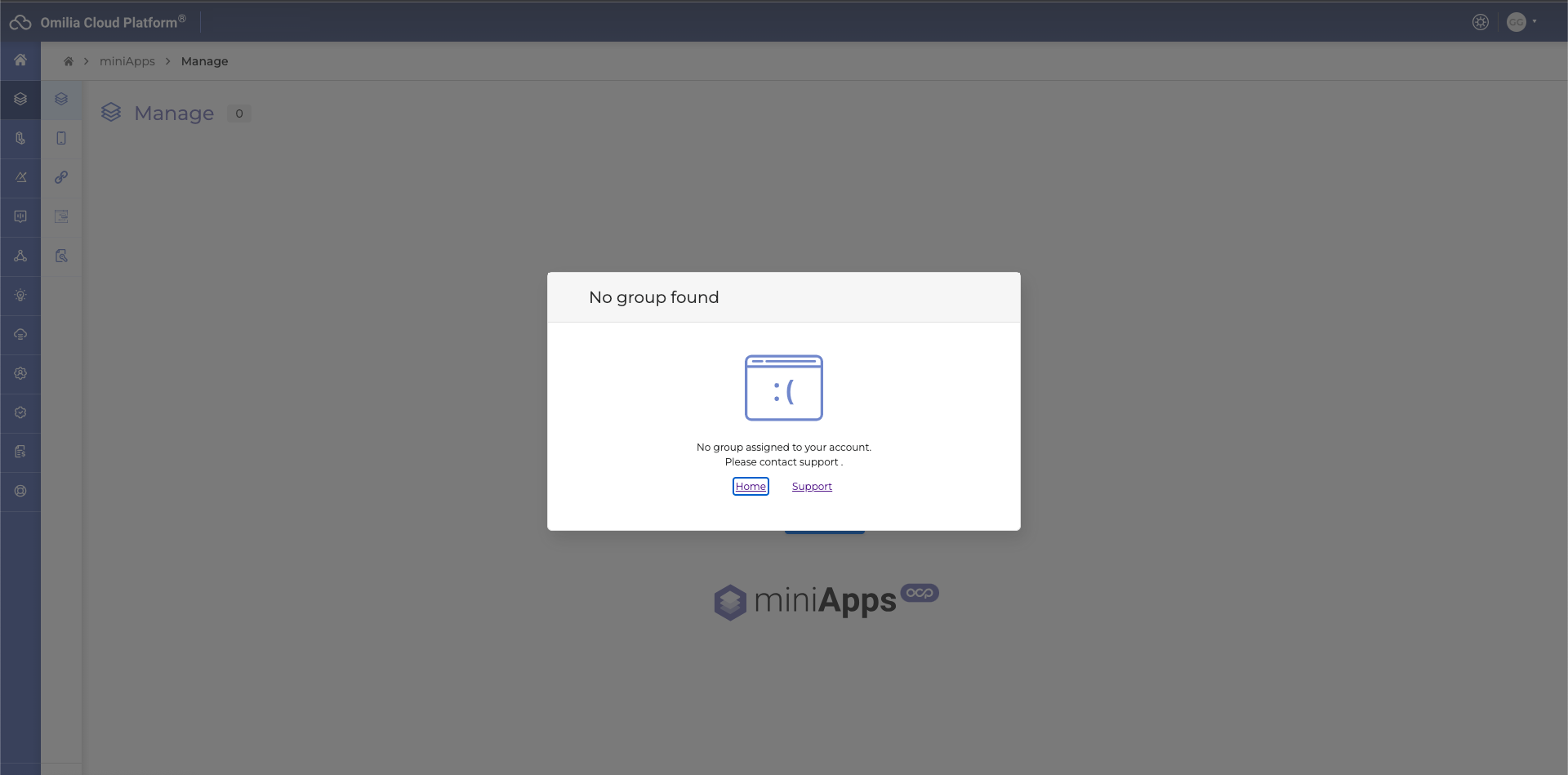 It is not possible to create and view miniApps if you do not belong to a group. If the user does not belong to a group the corresponding info message will pop up when enter the miniApps menu.