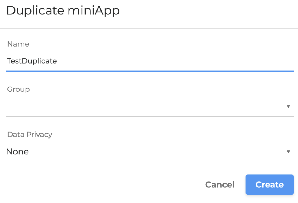 To duplicate an already created miniApp, click the context menu on the right side of the miniApp entry, and click Duplicate.