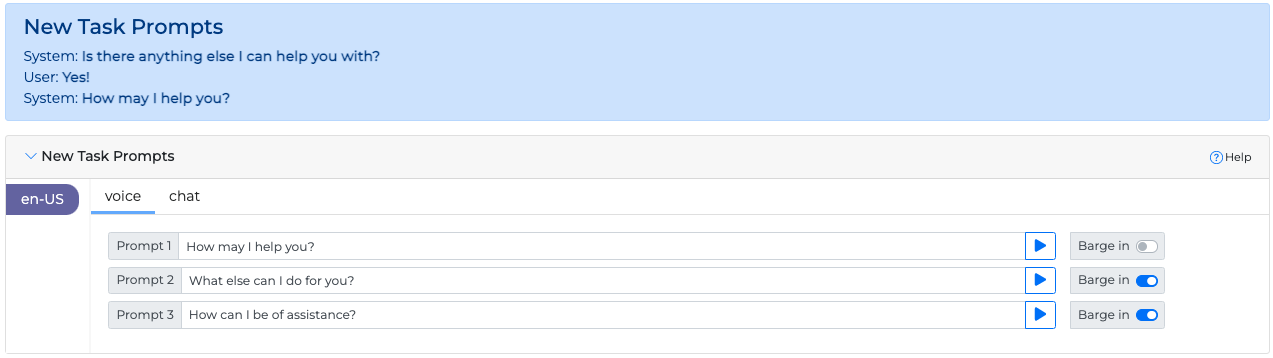 In case the caller responds positively to a question such as "Is there anything else I can help you with?", New Task Prompts will continue the conversation based on the defined prompts.