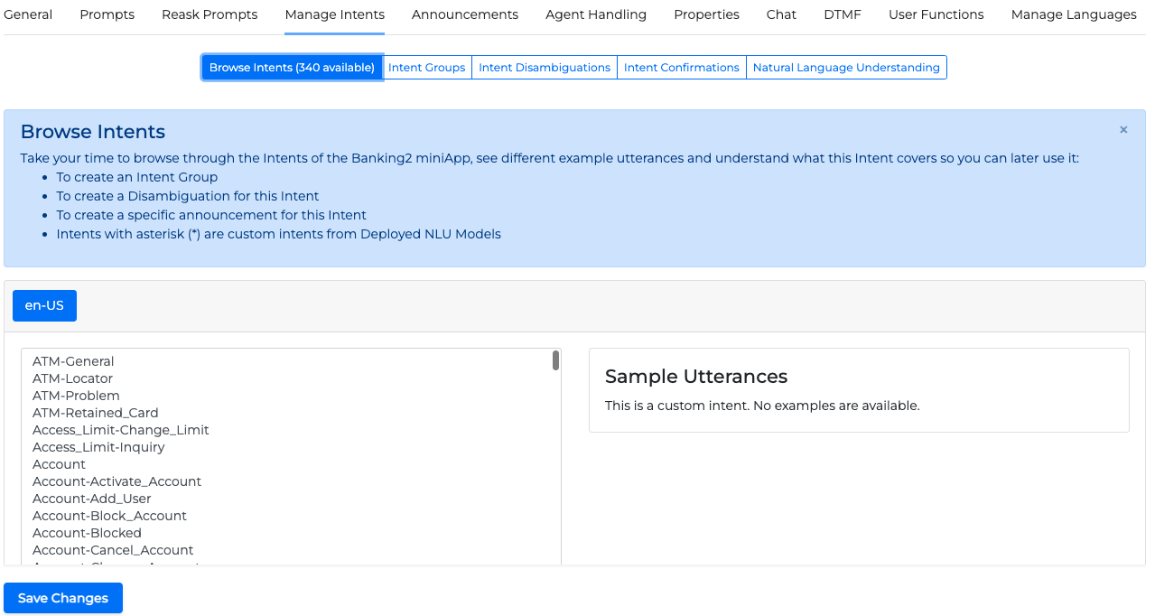 In this tab you can browse through the intents associated with the selected Intent miniApps, see the different sample utterances and understand what this Intent covers so you can later use it: