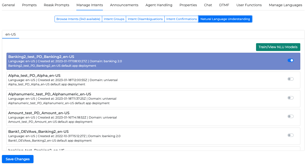 Manage Intents tab