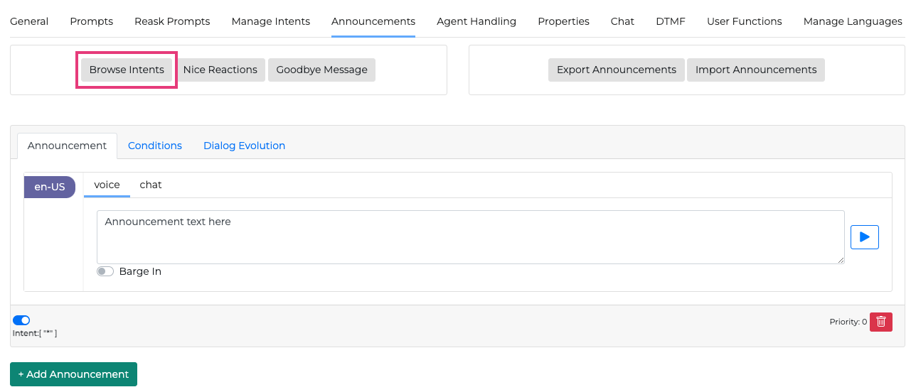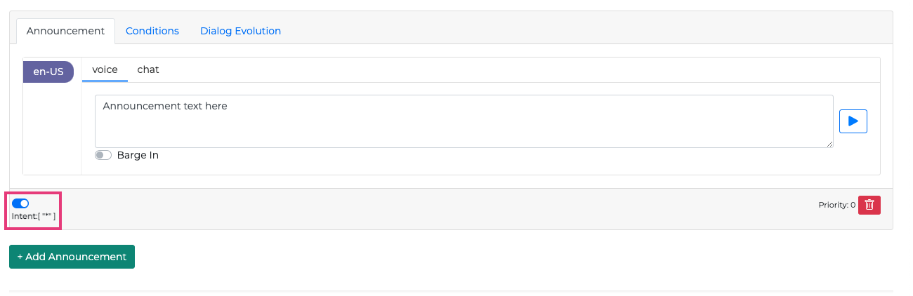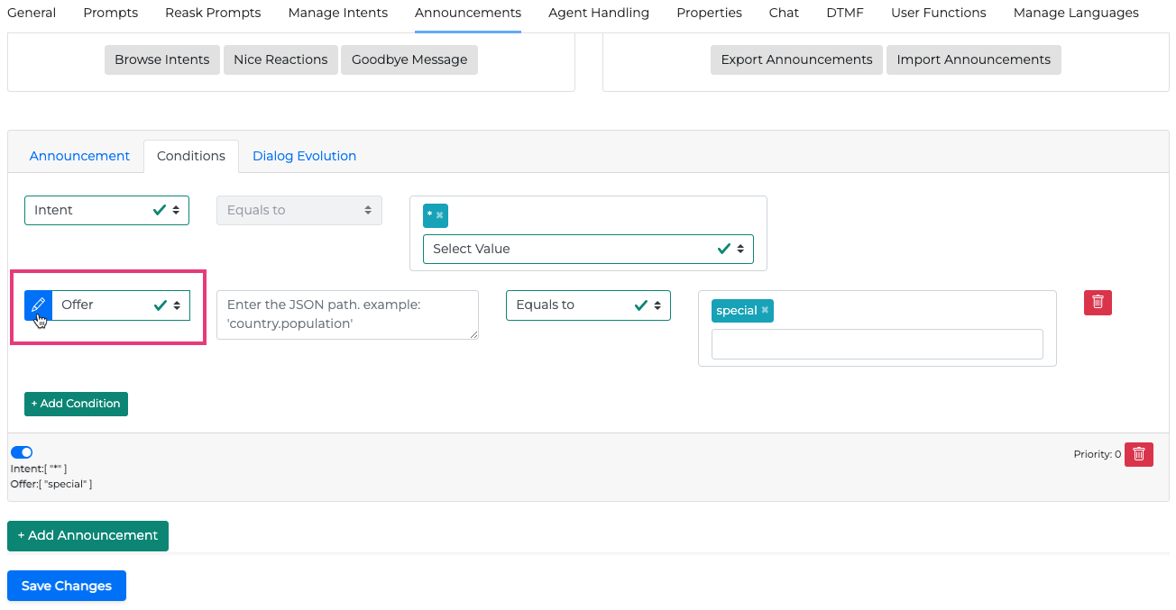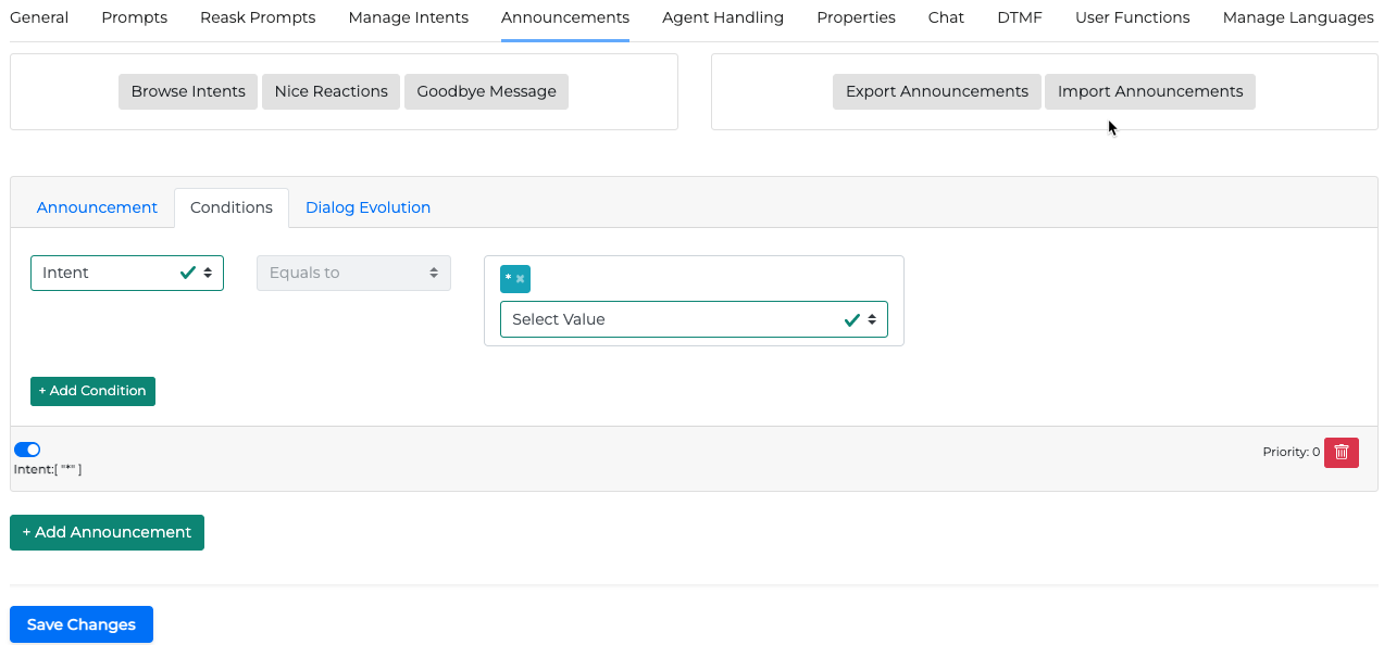 In the Announcements tab you can set as many announcements as you want and link them to one or more intents from the Conditions tab. You can also choose additional entities in your conditions if you want to make the announcement more specific. Announcements can be a defined pre-selected text or based on a created knowledge base.