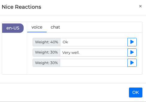 In the Nice Reactions window you can optionally set nice reactions. Whenever the application identifies an intent that is not ambiguous, then it throws a nice reaction before the announcement randomly (according to weight) to make the dialog sound more conversational.