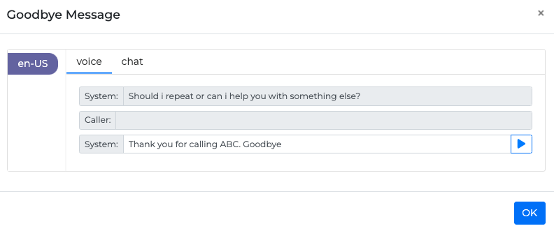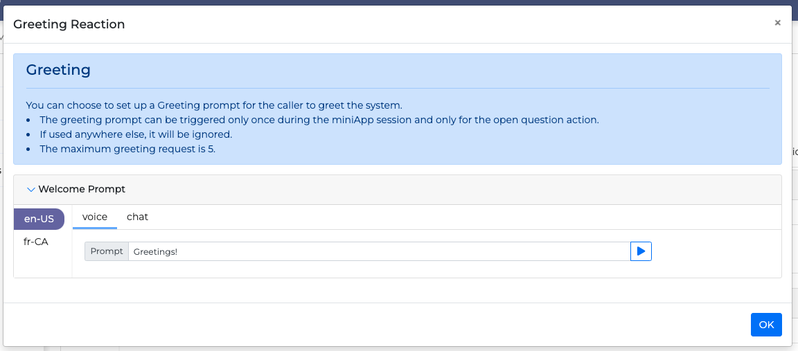 Sometimes, when prompted for input, a caller may first greet the application instead of giving the input directly. For these cases, it is possible to configure a Greeting Reaction, which will trigger in conjunction with the initial prompt resulting in a more human-like experience.