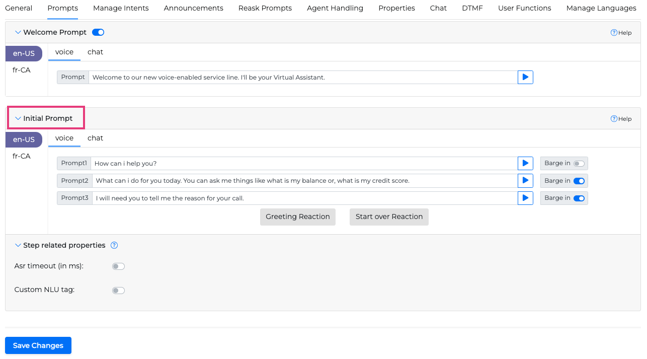 If you want to activate barge-in for each step, use the toggle on the right side of each initial prompt: