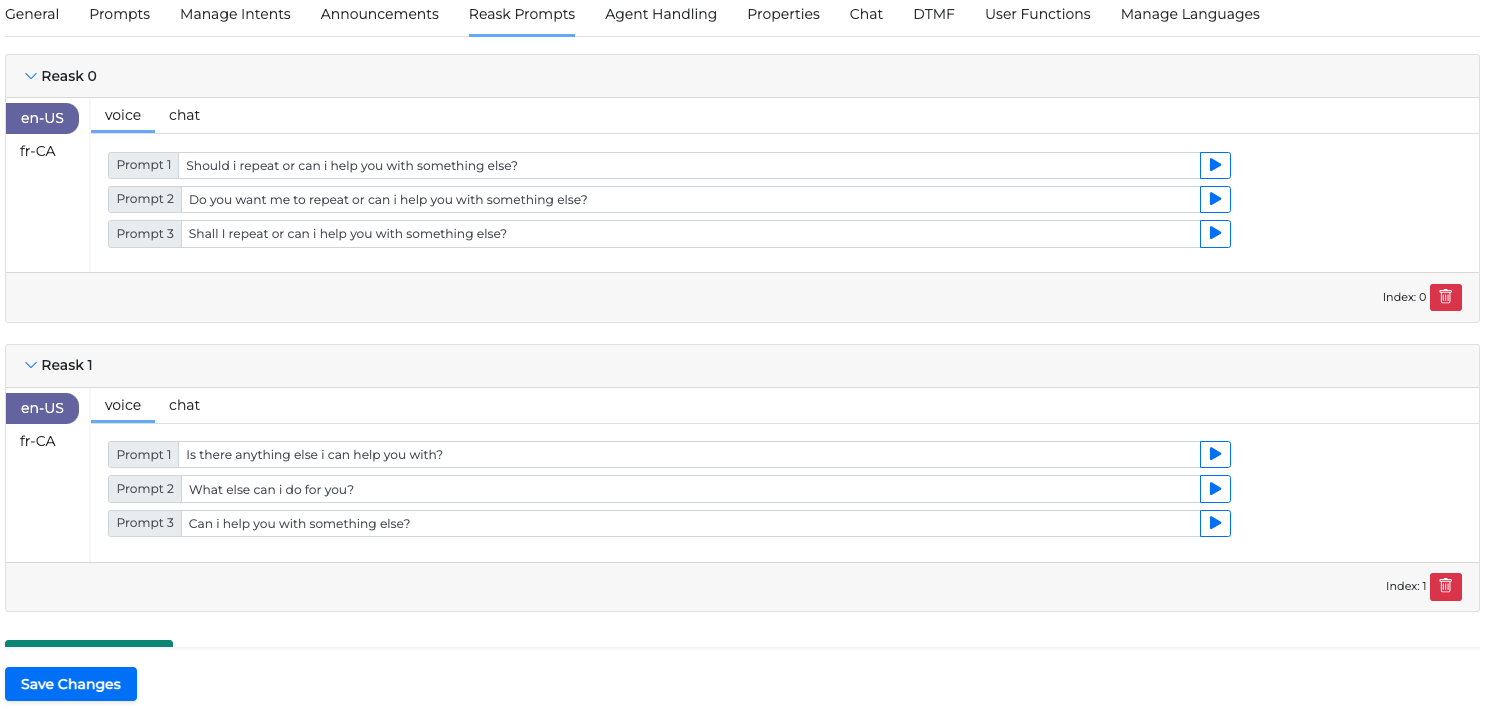 If the user disconfirms the intent, the system removes it so the Intent miniApp will ask for a new intent using the questions specified in the Reask Prompts tab: "So, is there anything else I can help you with?"