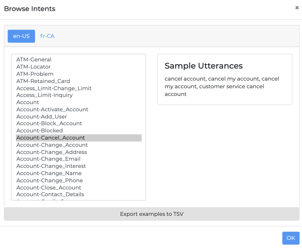 To export the intents and sample utterances, select the Export examples to TSV button.