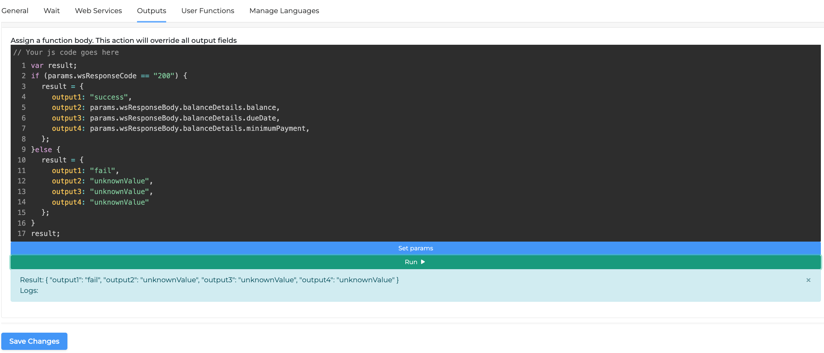 Finally, if you need to consider the Web Service or Intelli miniApp invocations as failed, you can add the FailExitReason property in the output object like the example below.