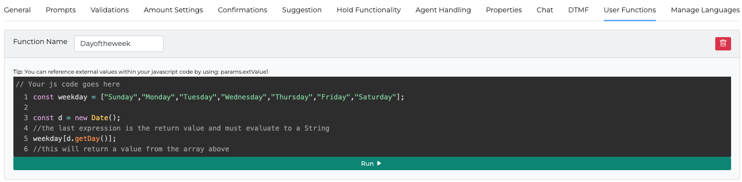 A JS function created under the User Functions tab can be called from everywhere in the specific miniApp, such as prompts in all miniApps, web service settings in Web Service miniApp using the mustache notation {{userFunctionName}}, or an output path in a Web Service miniApp.