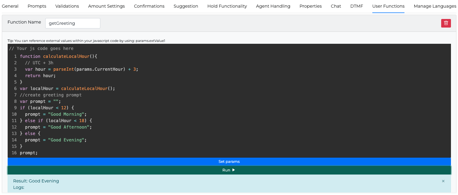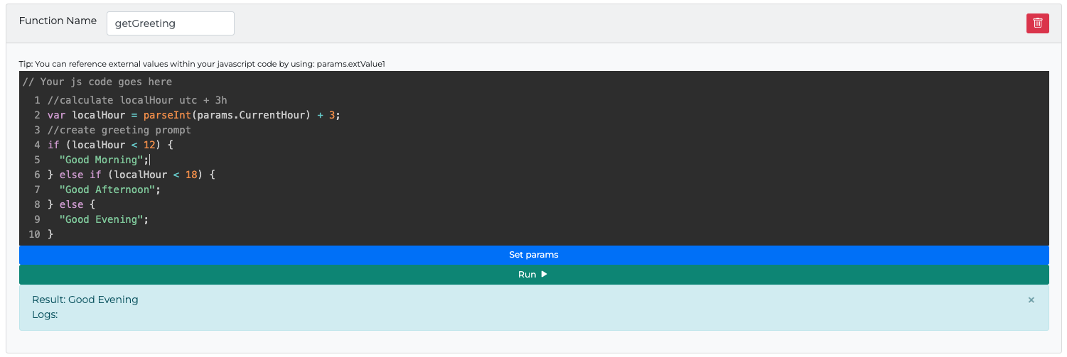 Example: {{getGreeting}} -> "Good Morning" or "Good afternoon" or "Good Evening".