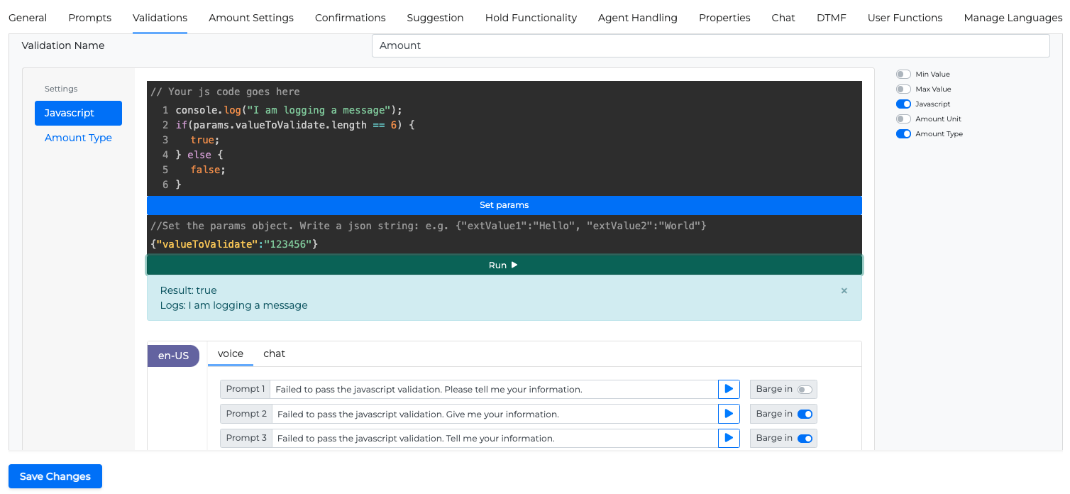 Validation JavaScript function can be used in the Validations tab in non-Intent miniApps like Alpha, Numeric, Alphanumeric, Amount, Date, and Text.