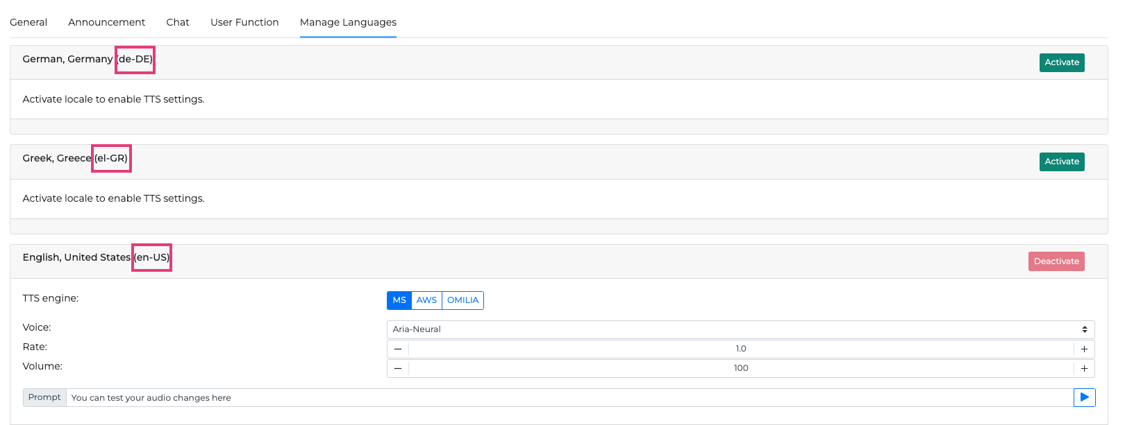 To find supported locales, go to your miniApp, on the Manage Languages tab. There you will see available locales (For example, de-DE, en-US, el-GR).