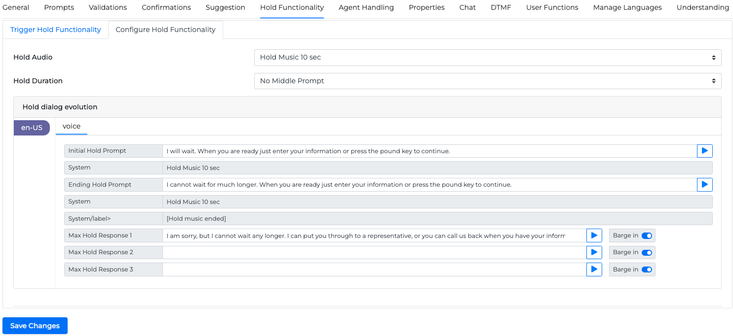 Select Configure Hold Functionality to configure the dialog evolution and exit.
