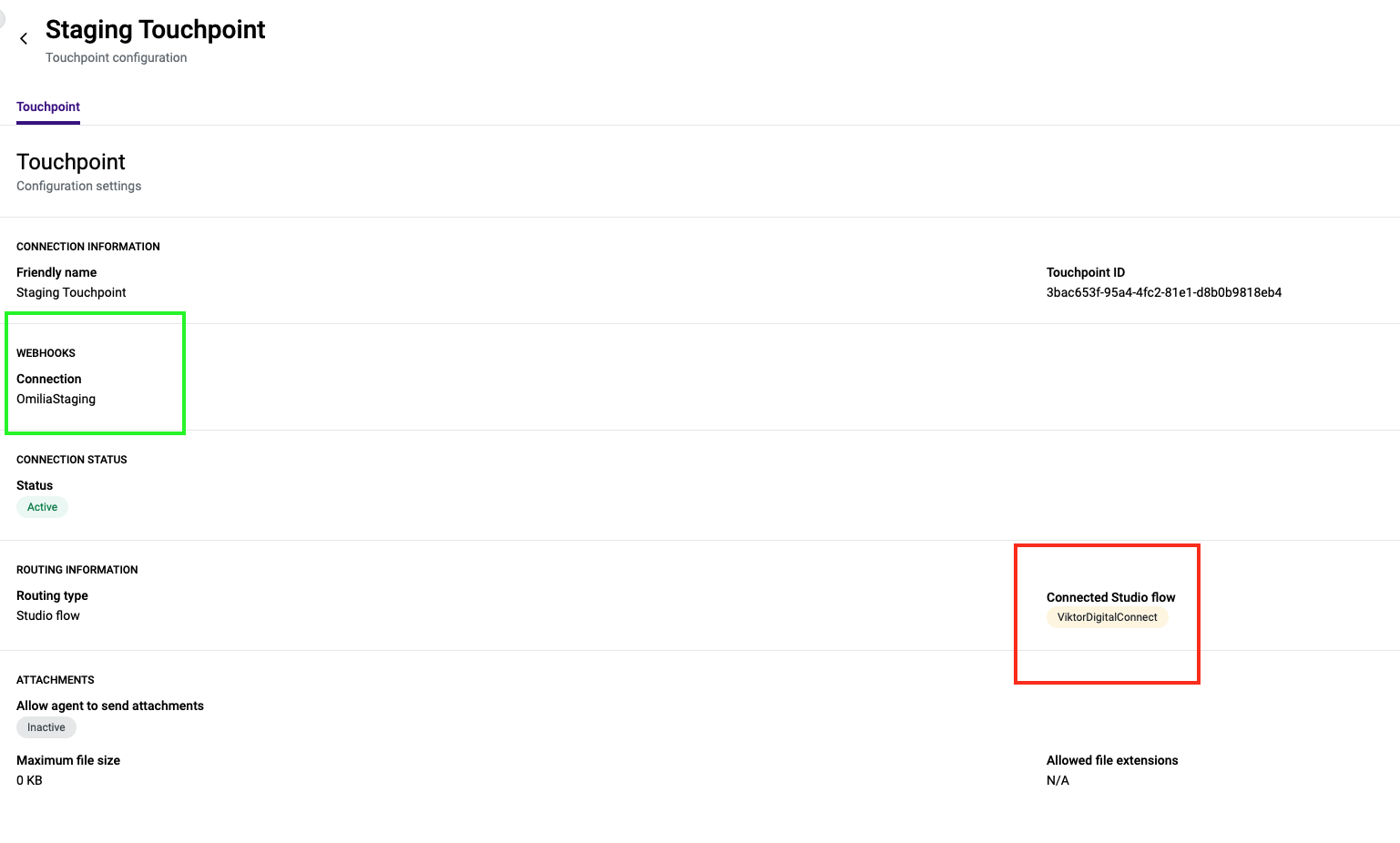 Touchpoint ID | In Talkdesk, navigate to Admin → Channels → Digital Connect → select the needed touchpoint from the list and copy its Touchpoint ID. Each touchpoint is connected to specific webhook configuration and Studio flow. Click a touchpoint to see the configured values as shown below: