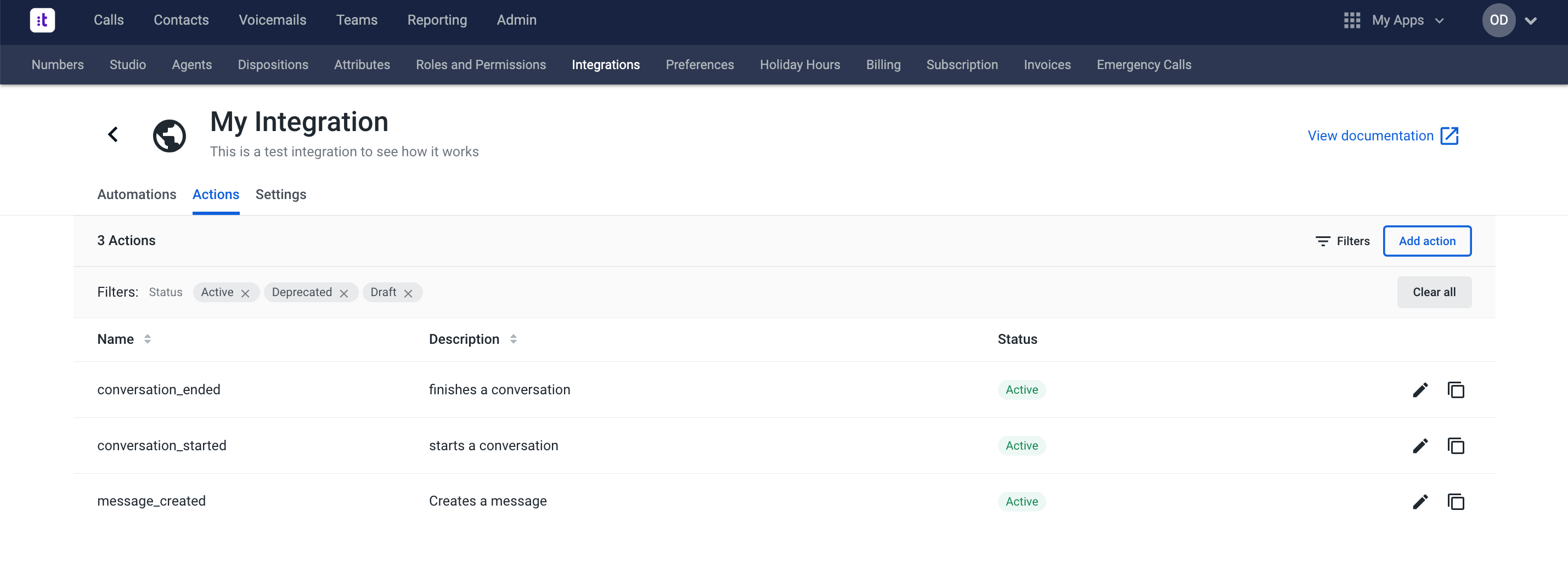 Repeat steps 2-4 to create three actions in total. The created actions will be listed as shown below. Make sure that all three actions are in the Active status.