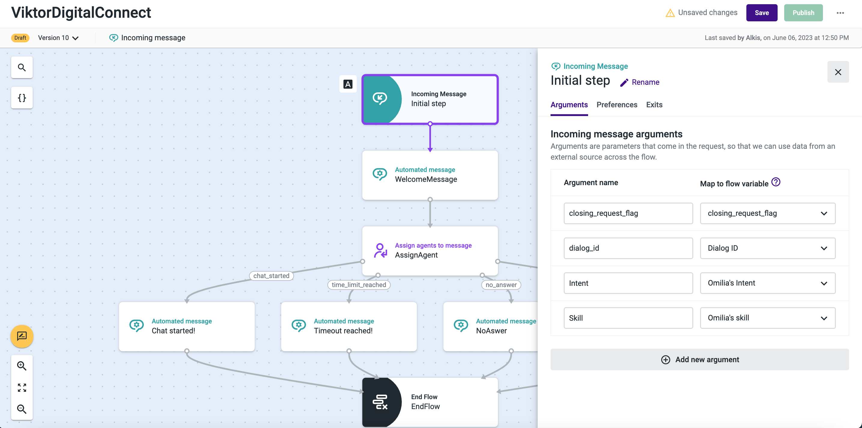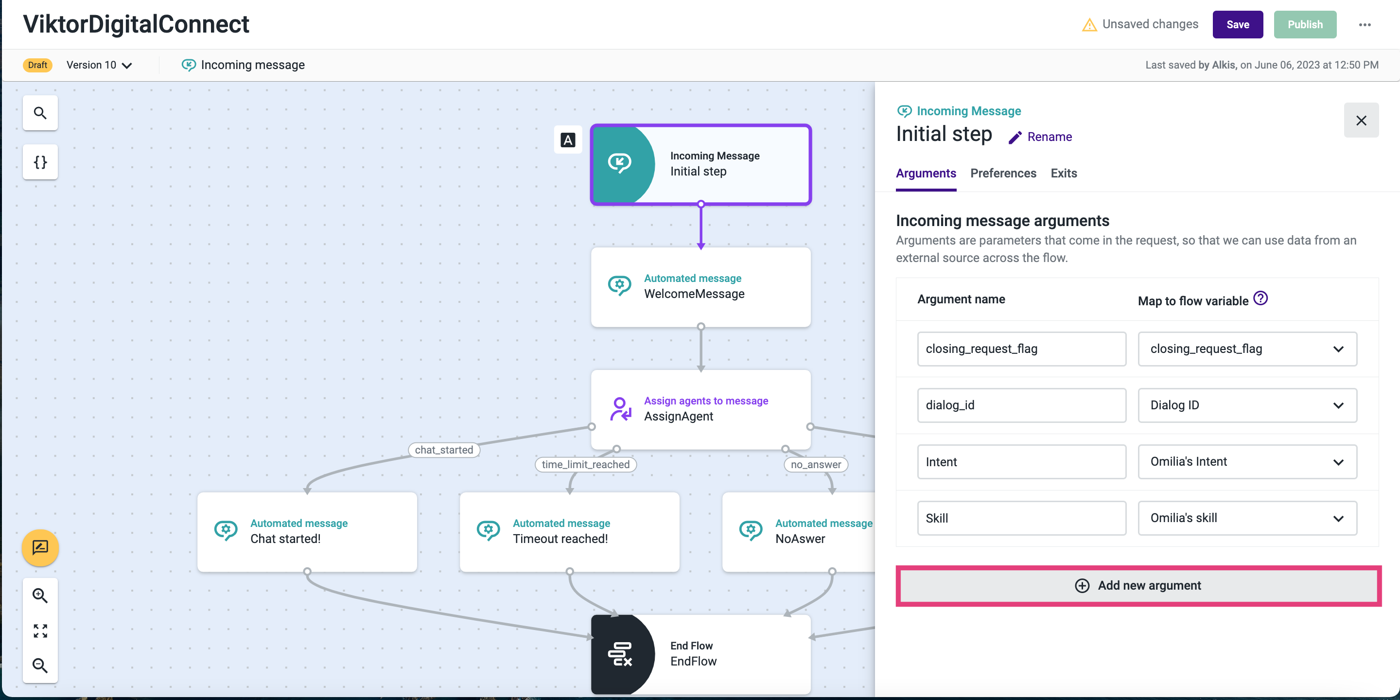 Click Add new argument and insert the name of the argument. These arguments are the fields from the flow that will be exposed to an agent. You can use the arguments based on your needs, for example, Intent of the customer, or a Reason for transfer.