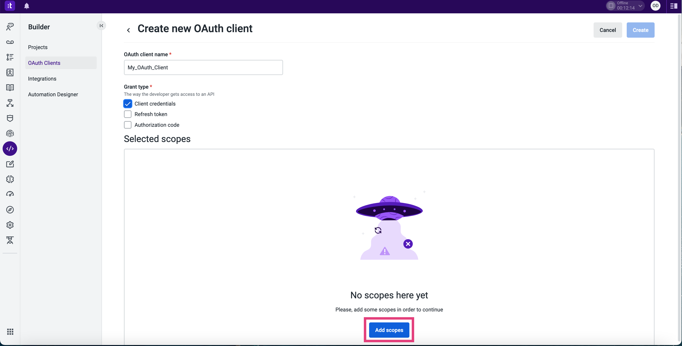 On the opened page, enter the OAuth client name and mark the Client credentials checkbox.