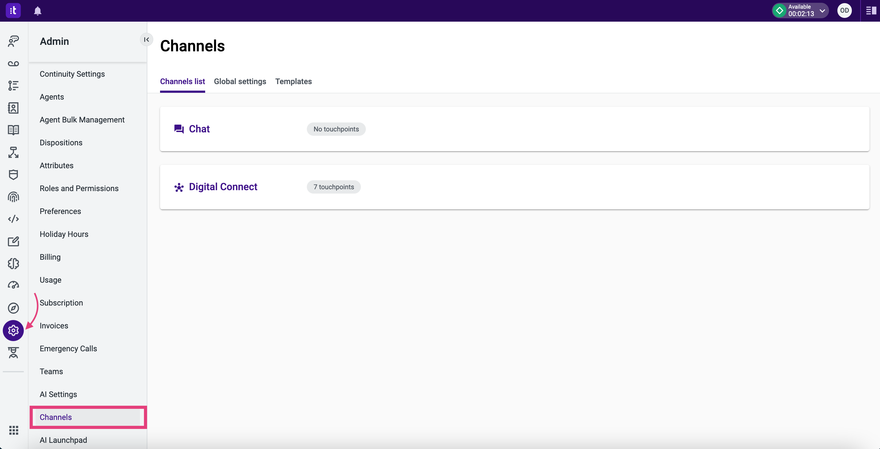 Navigate to the Admin section and select Channels. Here you can see the list of all available channels.