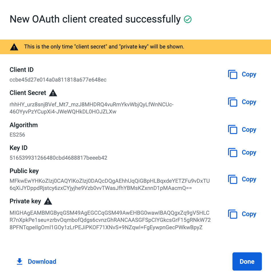 The Client Secret and Private key are only shown once after their creation. Make sure you have saved them safely!