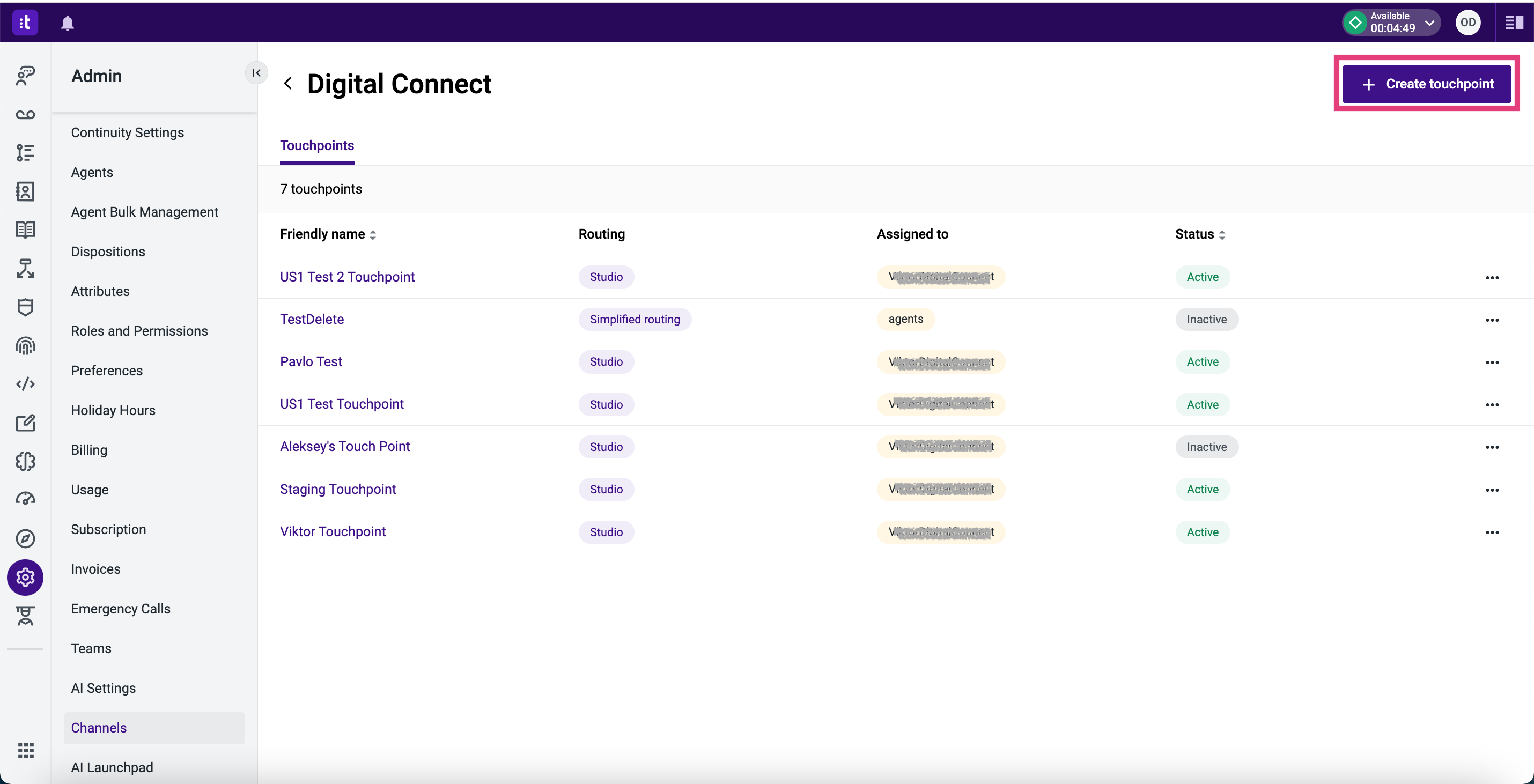 Click Digital Connect. The following page opens and you can see the list of available touchpoints.