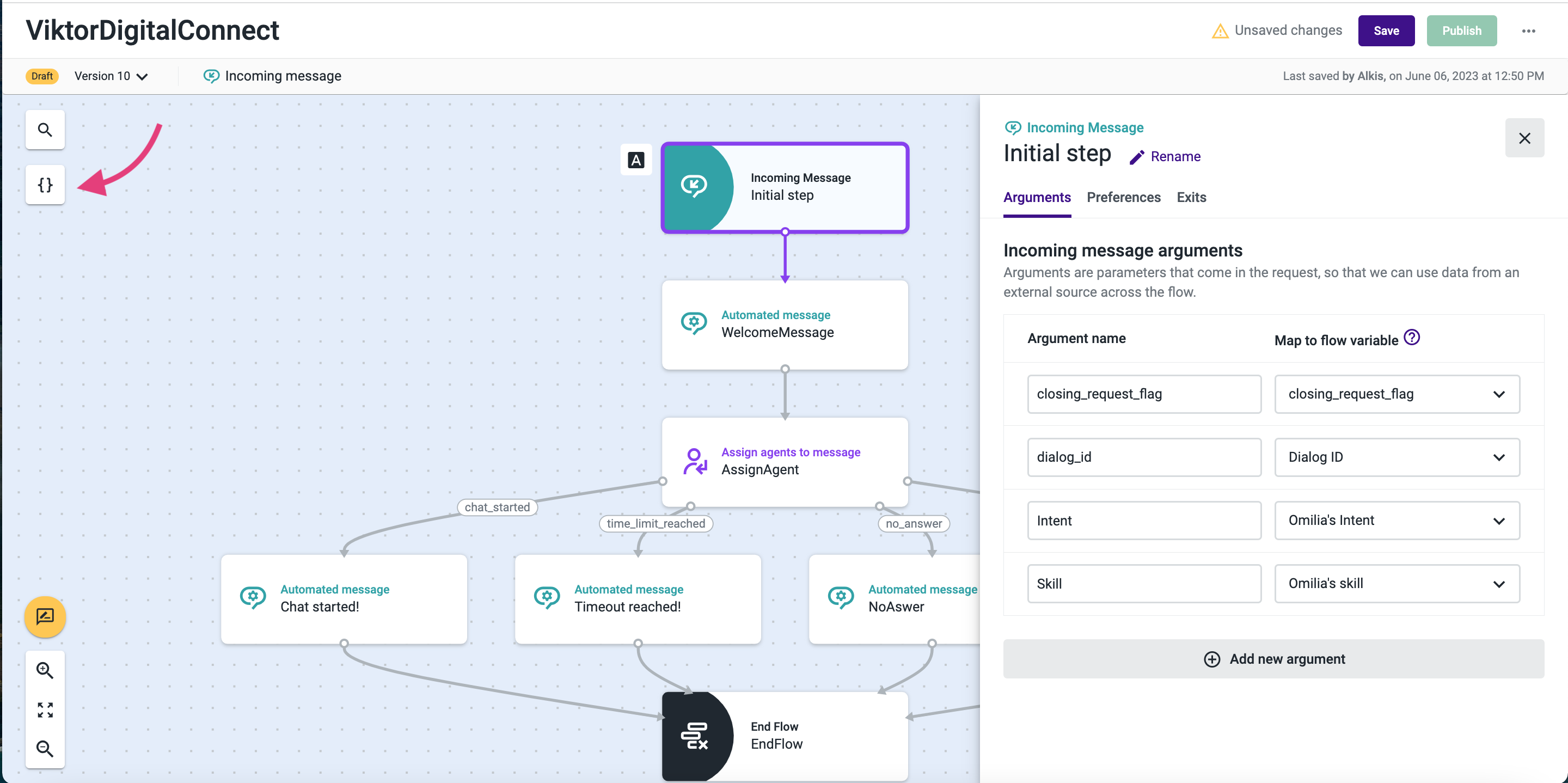 At this step, you need to configure the Studio arguments which are used to map the information that can be brought from OCP®. Arguments are parameters that come in the request from OCP® and can be used across the Flow in Talkdesk.