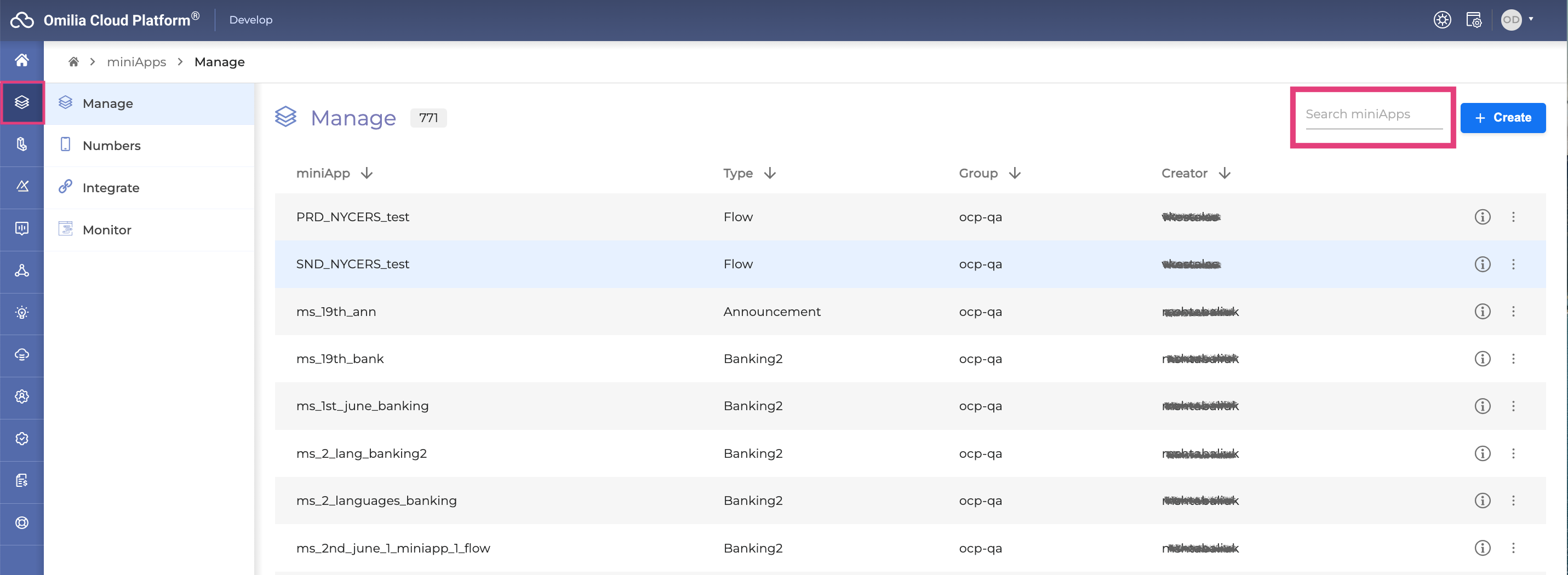 Select miniApps → Manage and search for the needed Flow using the search field.