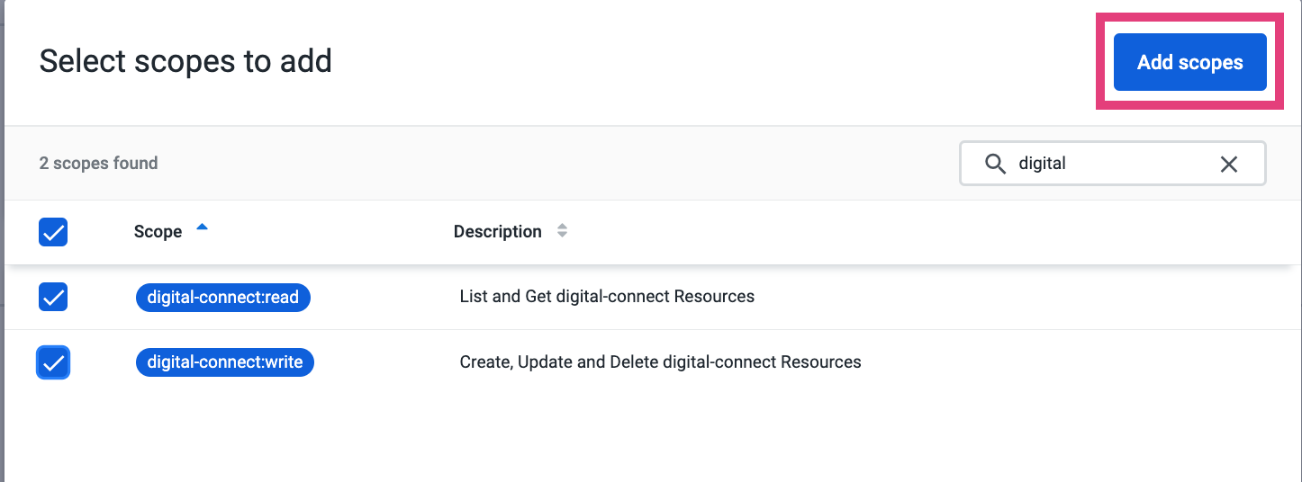 On the opened page, select the following scopes from the list: digital-connect:read, digital-connect:write. Use the Search field to find the needed scopes. Then click the Add scopes to confirm the selection.