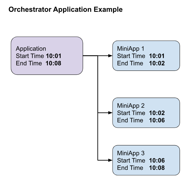 The following Time Series example is designed to help you understand how a Production Call with multiple steps and miniApps is represented in real-time metrics.